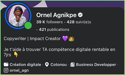 Je m'appelle Ornella Agnikpe, copywriter depuis 5 ans, formatrice et créatrice de contenu sur Facebook (avec 39.000 abonnés).